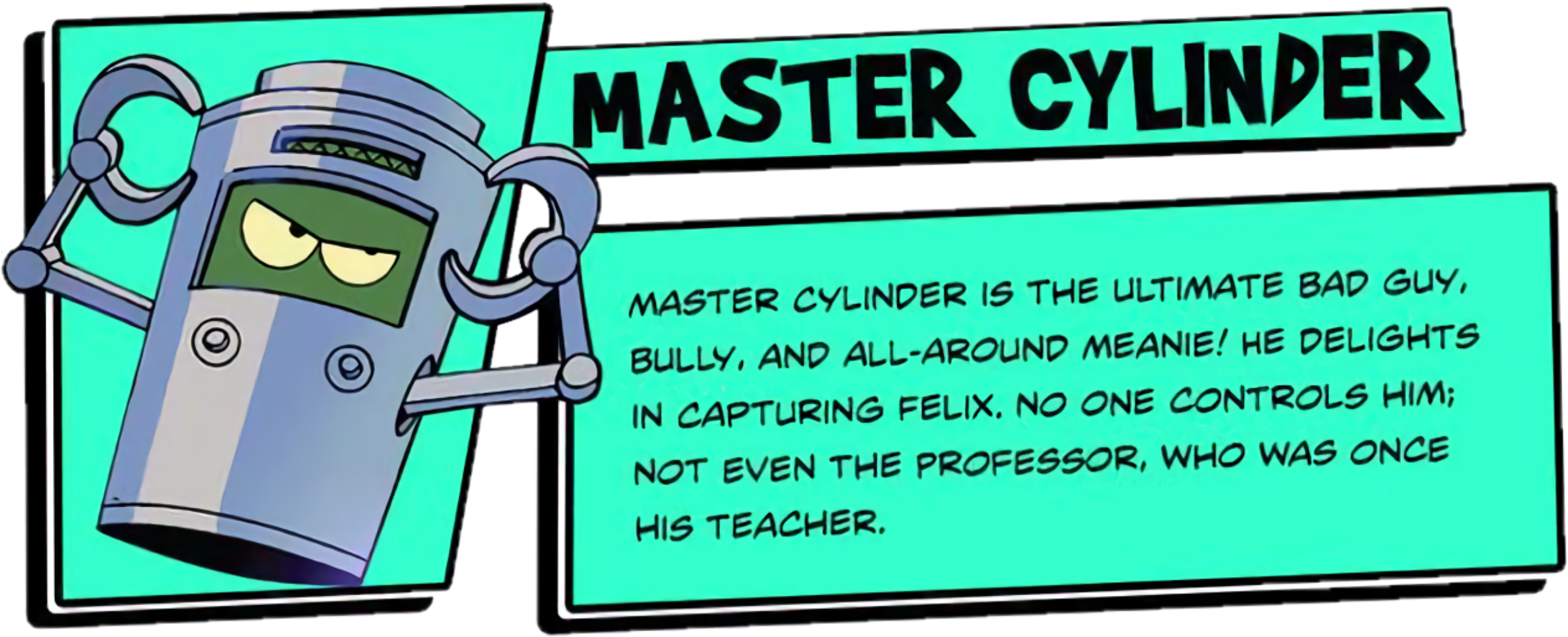 The Master Cylinder was an evil cyborg that appeared as a major antagonist in the 1960 Felix the Cat cartoon "Master Cylinder - Master of the Moon" (where he calls himself "King of the Moon") and he first appeared in Joe Oriolo's 1959 revival of Felix the Cat, he would then proceed to become one of Felix's main enemies throughout the series: unlike the Professor, Master Cylinder was never helpful or friendly to Felix in any of his appearances and remained villainous (while The Professor often switched between the role of an antagonist and an uneasy ally), except for one episode from the 50s where everyone, including the Professor and Rock Botton, celebrates Felix's birthday.. In his first appearance, he was defeated by being unplugged. He overcame this weakness by gaining feet and operating with a different power source. He can extend his arms, fly, and shoot lazers from the yellow rectangle on his forehead.