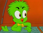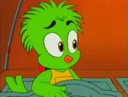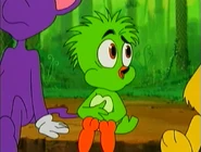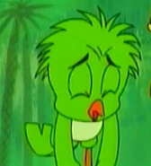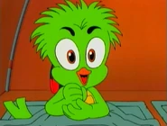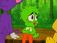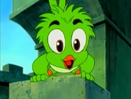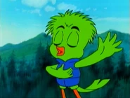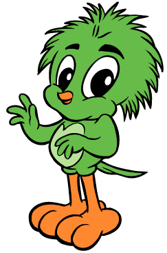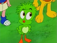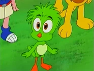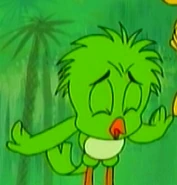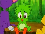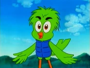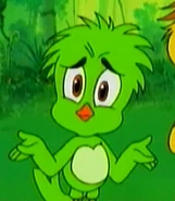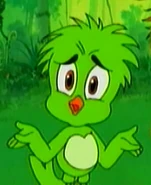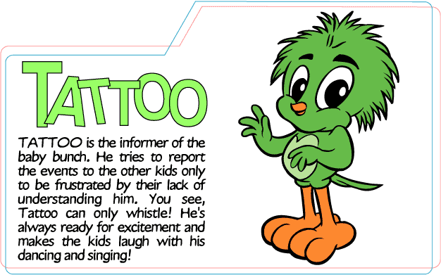 Tattoo is an Aple green bird with furry hair on top, flora chest pattern that shaped like a heart, carrot colored beak and legs, V shaped tail, and he also has mocha brown eyes.